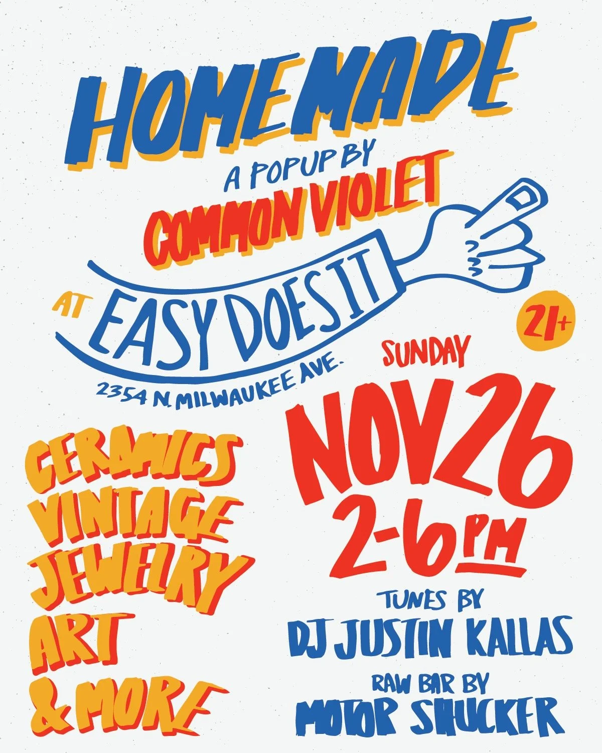 The HOMEMADE Popup is returning to Easy Does It for the third time this year! Come check out homemade ceramics, vintage jewelry, art, and so much more – all from a lineup of local Chicago vendors curated by Alicia of Common Violet. Or just come to hang and party! Motorshucker will be there slinging oysters and tunes will be provided by DJ Justin Kallas.